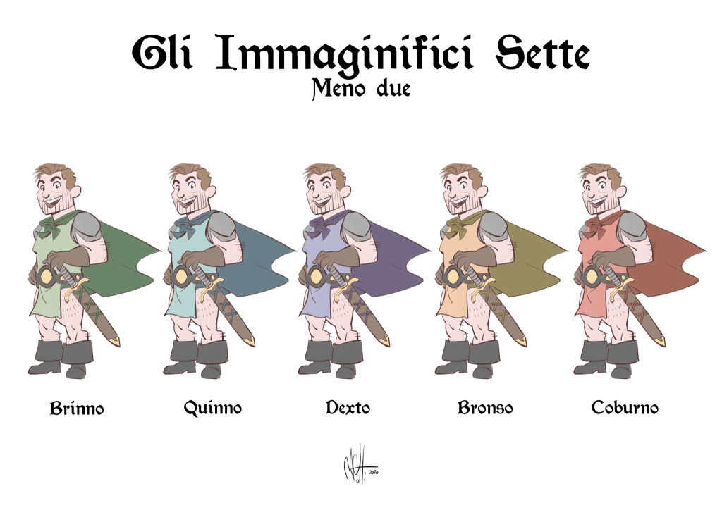 “Gli immaginifici sette sono un gruppo di guerrieri ottimisti che sovrastimano clamorosamente le proprie abilità, immaginandosi come grandi combattenti in grado di affrontare ogni avversario. Questo è dovuto al fatto che, fondamentalmente, fino ad oggi si sono allenati solo fra di loro, senza mai uscire dal proprio campo di addestramento, dandosi grandi pacche sulle spalle e incitandosi a vicenda, ma evitando accuratamente di sfidare qualcuno fuori dalla loro bolla. In mancanza di un vero confronto, si sentono fortissimi e destinati alla gloria, da consacrare ovviamente alle loro divinità: Dunning e Kruger. Questa avventura sarà il loro primo e vero banco di prova e, probabilmente, la loro tomba. Però sempre con grande entusiasmo eh?