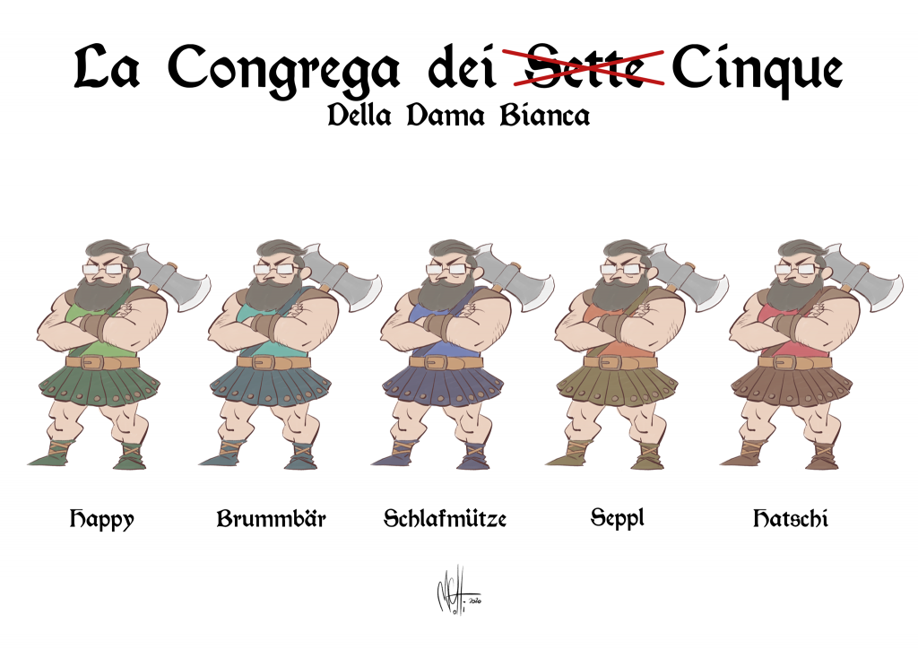 “La Congrega dei Sette (ora Cinque) fu istituita come guardia privata della Dama Bianca delle Nevi, per servirla e proteggerla. Nefasto fu il giorno in cui essi fallirono e la Dama fu rapita. Da allora i sette (no, cinque) vagano per queste terre alla ricerca della loro protetta per lavare via l’onta del fallimento. Notizie recenti dicono che alcuni indizi sulla Dama Bianca siano custoditi all’interno di un antico dungeon. Che la ricerca abbia inizio!