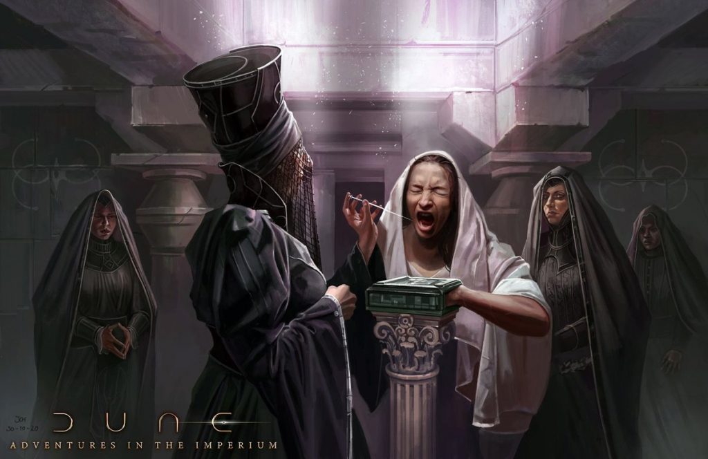 E ora, in Dune: Avventure nell’Imperium, tu e i tuoi amici potrete esplorare il pianeta di Dune così come i molti pianeti dell’Impero, esplorandolo attraverso il contesto di un gioco di ruolo. Le regole contenute in questo libro coprono la creazione del personaggio, le abilità e le capacità, i tratti della personalità come le pulsioni, l’equipaggiamento e la risoluzione dei conflitti, siano essi interpersonali, combattimenti corpo a corpo, schermaglie o anche lotte politiche basate sulla Casa. Le informazioni di base riguardano l’Imperium, il Landsraad, la CHOAM, le Bene Gesserit, la Gilda Spaziale e gruppi più piccoli come i Maestri di Spada di Ginaz, la Scuola Suk e i computer umani conosciuti come Mentat.