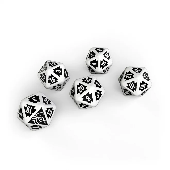 Il set di dadi personalizzati di DISHONORED – IL GIOCO DI RUOLO. Lanciate fino a 5 di questi speciali dadi a venti facce incisi su misura in color osso sbiancato e inchiostro nero. Il simbolo dell’Esterno marchia la faccia dell’1 per fornirvi i successi critici di cui avete bisogno durante le vostre giocate di ruolo.