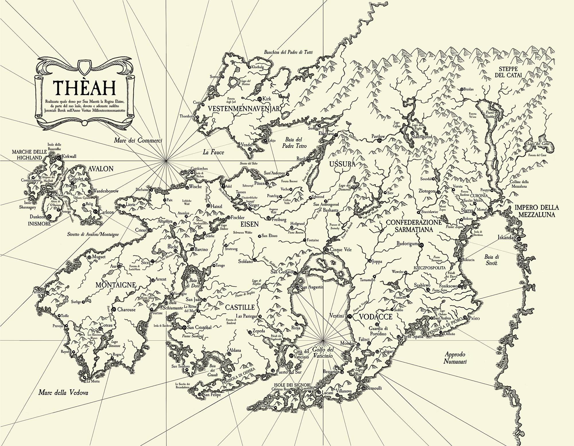 Théah è il continente dove si svolgono le avventure di 7TH SEA, un luogo simile all’Europa del XVII secolo, dominato da Nazioni che hanno molto in comune con gli stati che si stavano delineando all’epoca. Tuttavia, Théah non è semplicemente la sorella gemella del continente europeo, bensì una sua lontana cugina, di cui è possibile apprezzare facilmente storia e cultura, al contempo esplorando i misteri legati alla Stregoneria che ciascuna Nazione custodisce gelosamente.
